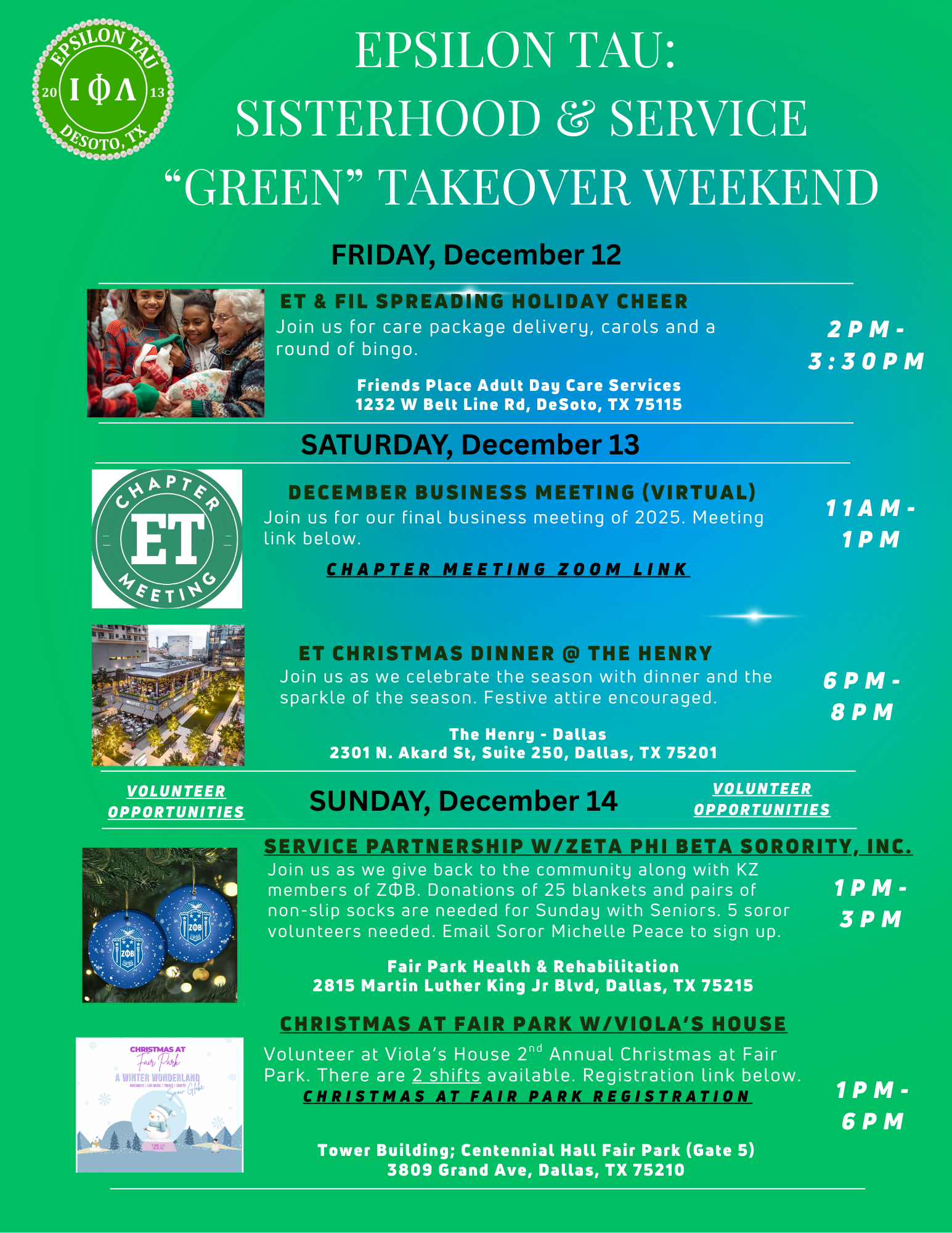 This weekend support local businesses and wear the color green. ET will spend the weekend in service and sisterhood. |